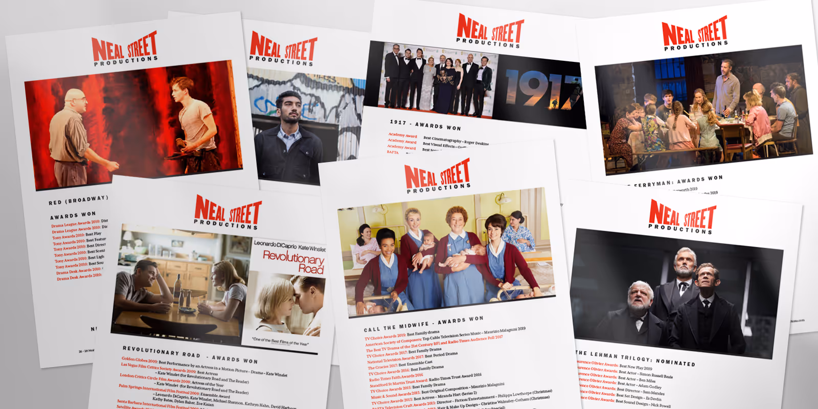 Neal Street are one of the UK's most respected production companies. They create distinctive and successful work for stage and screen on both sides of the Atlantic; 1917, Call The Midwife and The Leyman Triology are just three productions that show the breadth of their talents. Led by one of the most prominent and successful directors Sam Mendes; together with Pippa Harris, Caro Newling and Nicolas Brown, Neal Street have been producing multi-award winning entertainment across film, theatre and television since 2003.